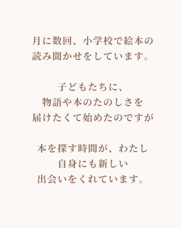 月に数回、小学校で絵本の読み聞かせをさせてもらっている私。子どもたちに物語や本の楽しさを届けたくて始めたのですが、本を探す時間が、私自身にも新しい出会いをくれるんです。