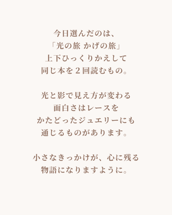 この面白さ、実はアンリガトウのジュエリーにも通じるものがあるなぁって思うんです。レースをかたどった繊細なデザインは、光の当たり方で表情を変えて、色々な表情を見せてくれる。まるで、小さなきっかけが、心に残る物語になるみたいに、日々にそっと輝きを添えてくれるんです。